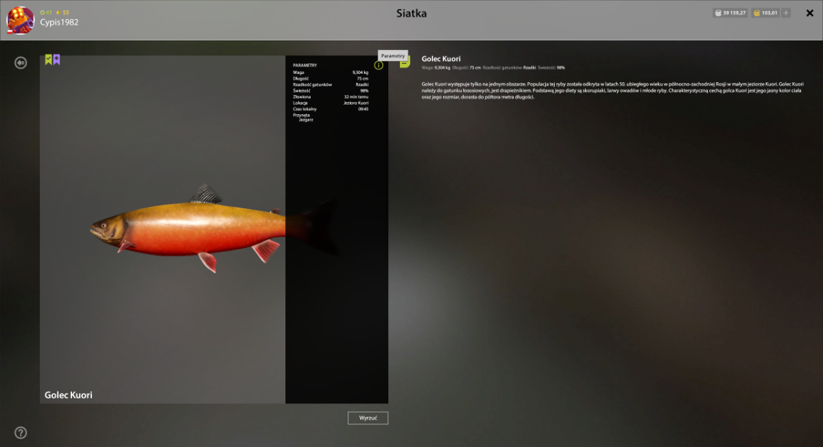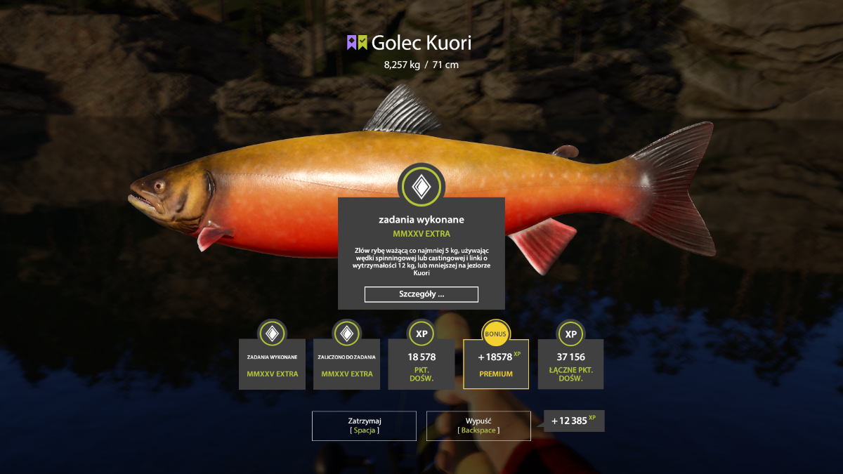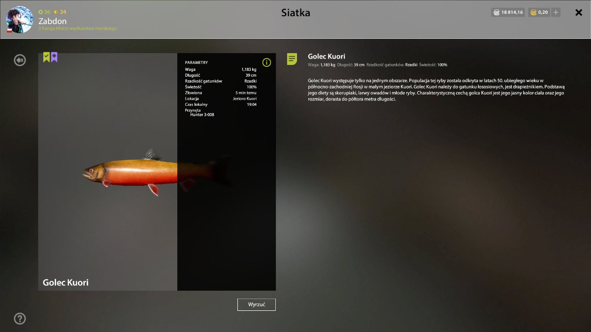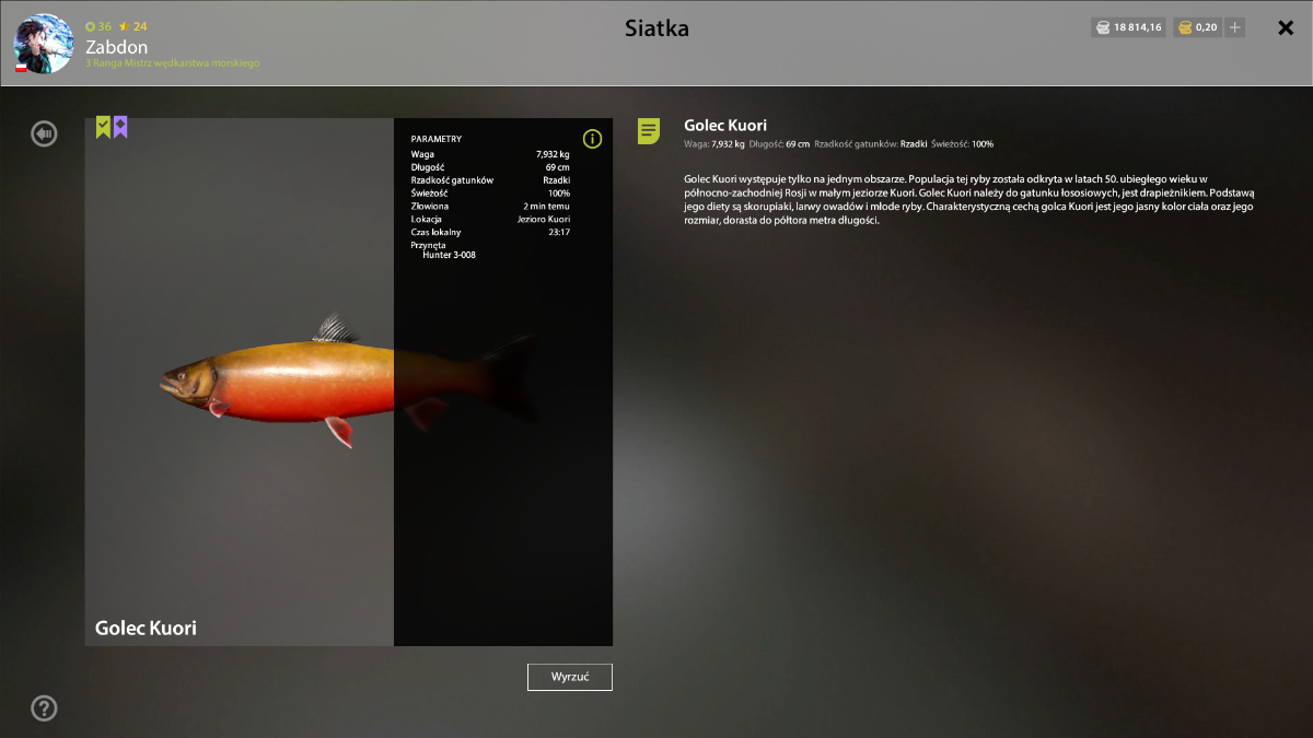 Levo Opublikowano 29 Listopada 2024 Udostępnij Opublikowano 29 Listopada 2024 Nasze media społecznościowe Wyzwanie tygodnia 23/12- 30/12- Golec Kuori Witajcie, Zapraszamy do wzięcia udziału, w wyzwaniu tygodnia dla graczy z polskiego regionu, korzystających z samodzielnej wersji klienta RF4PL. Co trzeba zrobić? Celem wyzwania jest złowienie ryby z gatunku: Golec Kuori o wadze najbliższej: 15555g Liczą się tylko ryby, które wzięły i zostały wyciągnięte, w czasie trwania wyzwania. Rozpoczęcie/Zakończenie: Start wyzwania: 23/12/2024, godzina: 12:00 Koniec wyzwania: 30/12/2024, godzina: 12:00 Nagrody: I. Miejsce - Trout Master S-M82M Nagrody zostaną wypłacone, w ciągu: 7 dni, od opublikowania wyników. Wyniki: Wyniki należy zamieścić, w tym temacie, do czasu zakończenia wyzwania. Można zamieszczać dowolną ilość postów, jednak pamiętajcie, że wygrywa tylko największa ryba. Wszystko zostanie dokładnie sprawdzone w logach, więc nie ma możliwości na jakiekolwiek oszustwo. W wiadomości należy zamieścić, następujące dane: Zrzut ekranu największej ryby Nazwę mapy, na której ryba została złowiona Dokładne współrzędne Przynętę Nick z gry Wyniki zostaną opublikowane, w ciągu: 7 dni, od zakończenia czasu wyzwania. Zasady wyzwania: Wiadomości, które nie będą zawierały wymaganych danych, nie będą brane pod uwagę. W przypadku, gdy kilku graczy złowi rybę o tej samej wadze, osoba która zamieści post jako pierwsza zostanie zwycięzcą. Nieczytelne zrzuty ekranu zamieszczone przez gracza, nie będą brane pod uwagę. Zgłoszenia do wyzwania łamiące regulamin lub zasady dobrego zachowania, nie będą brane pod uwagę. Wszelkie nieregulowane przypadki rozstrzyga administracja. W przypadku problemów z serwerem, połączeniem lub innych, administracja zastrzega sobie prawo, do zmiany terminu wyzwania lub wstrzymania go na czas nieokreślony. Ważne: W wyzwaniu mogą brać udział, tylko gracze z polskiego regionu, korzystający z samodzielnej wersji klienta Russian Fishing 4. Jeżeli jesteś zainteresowany przeniesieniem konta Steam na samodzielną wersję klienta gry, to wszystkie informacje znajdziesz, w tym temacie: Transfer konta ze Steam na klienta RF4 Powodzenia, Zespół FishSoft 1 Odnośnik do komentarza Udostępnij na innych stronach Więcej opcji udostępniania...